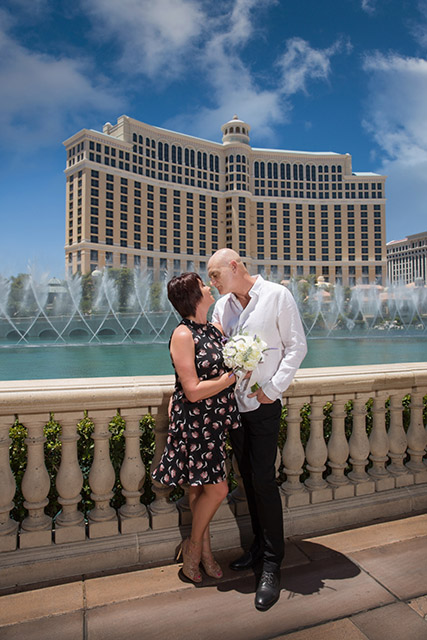 Secondly is the Location and what better spot then the Bellagio Fountains. It truly is the perfect back drop, My suggestions is to think about the time you wish to have your ceremony. It is certainly spectacular at night time, or the twilight hour is my favourite. I work with a wonderful celebrant who will meet you at the location and perform your ceremony, you can use the standard vows or write your own, she also completes all the legal paper work and files it back to the Clark County for you.